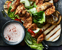 - Add the chicken to the pittas and drizzle over the yogurt sauce.