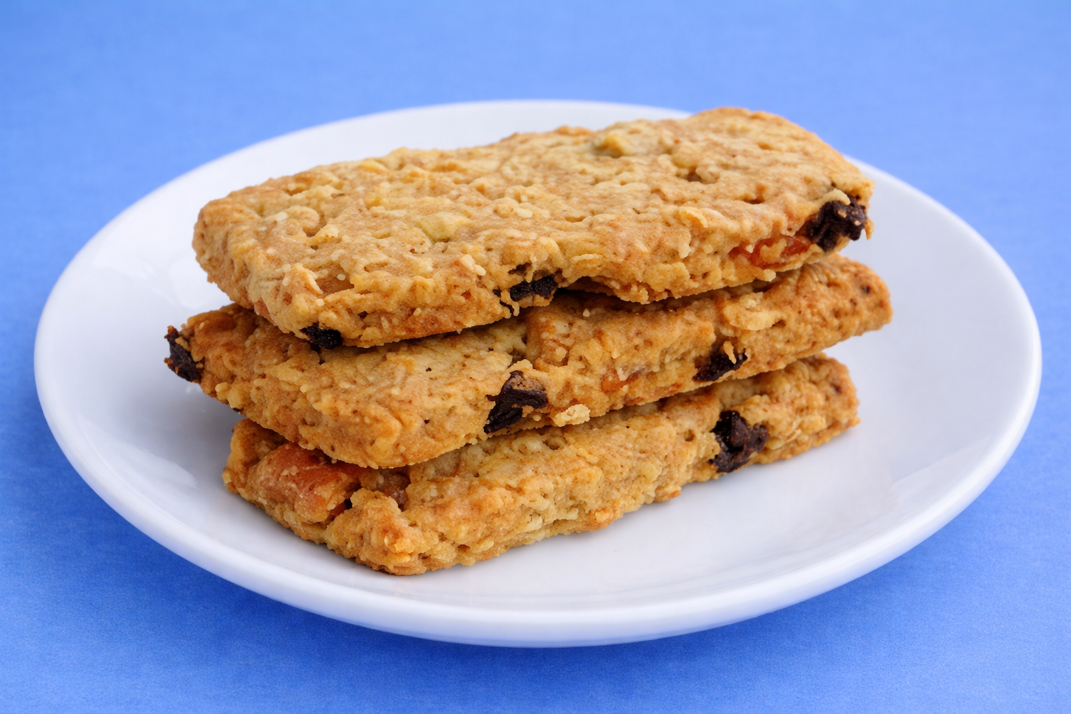 - In a separate bowl, mix together the remaining ingredients (oats, oatmeal, flour, egg yolk, baking powder and dried fruit) and then mix into the butter mixture to make a firm dough. Chill in the fridge for 10-15 minutes.