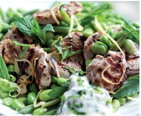 9. Make a dressing by mixing together the yogurt with the remaining lemon juice and rind and three quarters of the chopped mint.