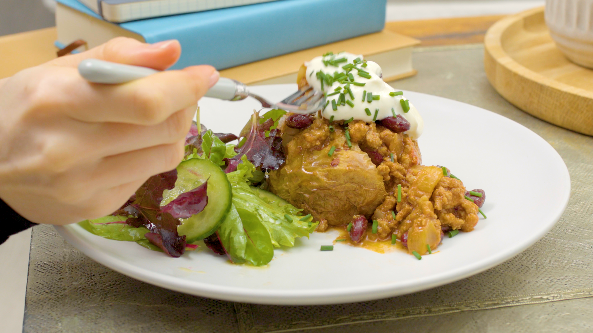 - Spoon the chilli and a spoon of soured cream over the potato and add some of the grated cheese.