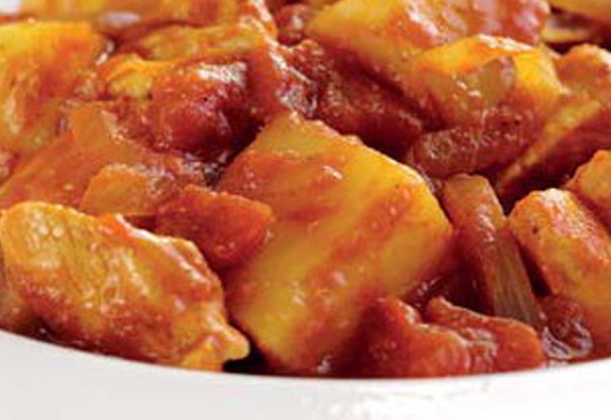 4. Stir in the tomatoes and 50ml water, cover and simmer gently for 5 minutes. Stir in the cooked potatoes and cook for a further 5 minutes.