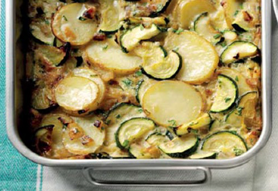 Frying pan, wooden spoon, vegetable knife, large bowl, fork, baking dish (greased and lined with baking parchment), oven gloves.