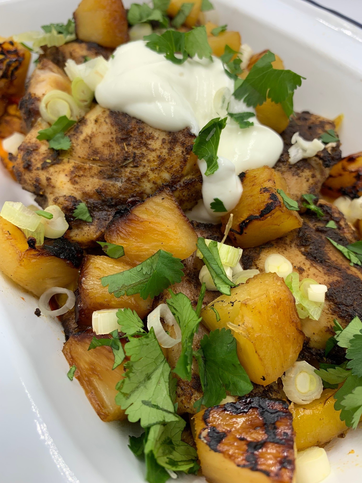 - Serve with a scattering of spring onions, the chargrilled pineapple and a spoonful of yogurt. Garnish with chopped coriander.