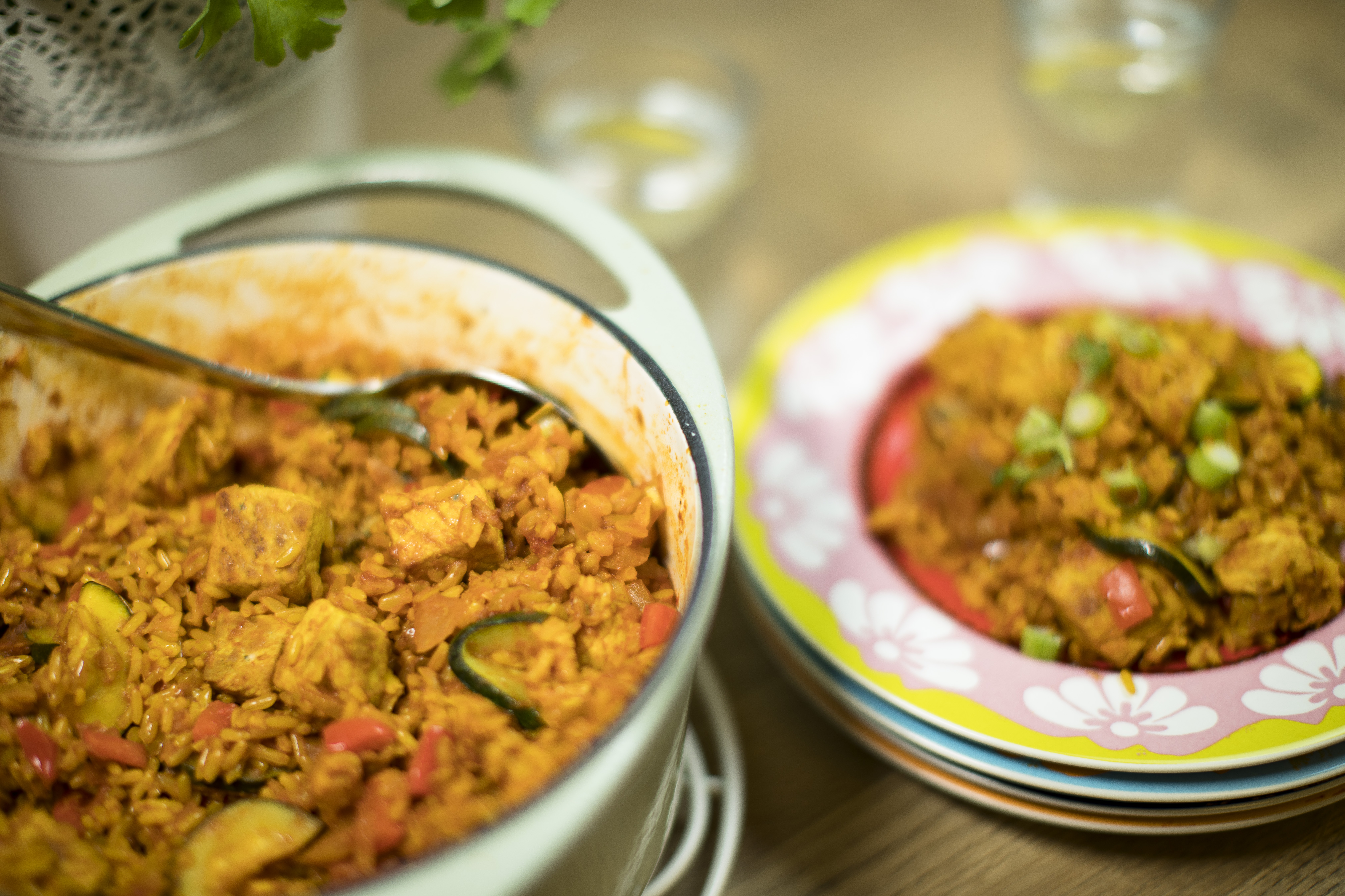 7. With the pan still on the heat at the onion, garlic, chilli powder, turmeric and brown rice.
